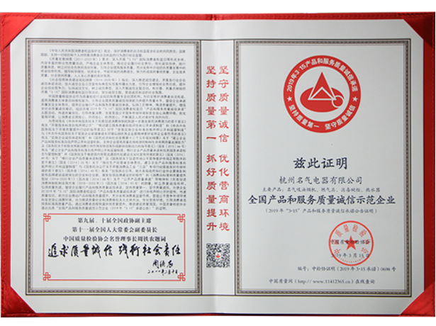 2019年度全國產(chǎn)品和服務質(zhì)量誠信示范企業(yè)