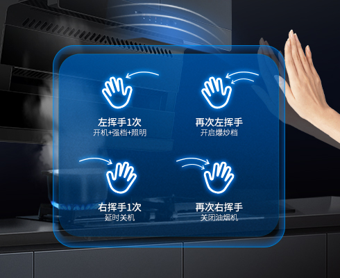 揮手控制煙機(jī)開關(guān),調(diào)節(jié)吸力強(qiáng)弱,烹飪期間自在操控