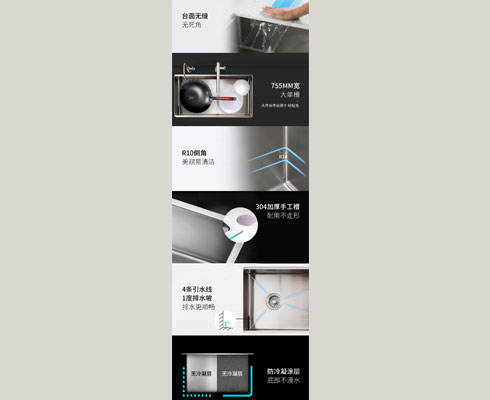 ①專利一體臺面設計,臺面無縫隙,一擦全干凈,臺面無斷面,廚房美觀時尚;②一體槽設計:大單槽,鍋碗瓢盆大件輕松洗,內嵌臺下盆,無縫易清潔;③韓國張浦304不銹鋼加厚質量好,更耐用;④R10倒角,精致、美觀、易清潔。