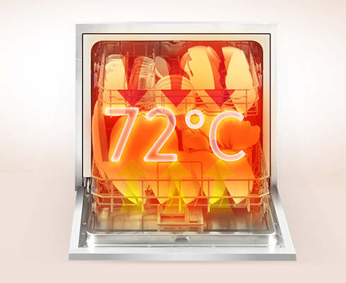 72℃高溫水洗,有效分離油脂,強力剝除重油凝結和米飯面團黏連等頑固污漬,比手洗更能有效解決洗碗難題。